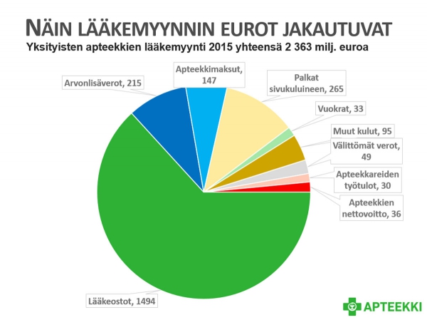 Viime kesästä lähtien mediassa on toistunut esimerkiksi väite, että suomalaiset maksavat lääkkeistään sata miljoonaa euroa liikaa. Alla oleva kaavio kertoo, mihin apteekkiin tulevat lääke-eurot menivät viime vuonna.