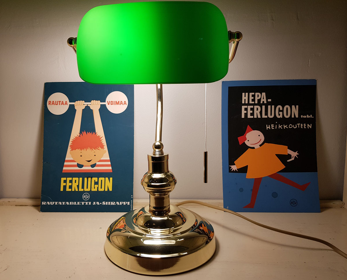 Kabinetin hyllyillä on aitoja lääkemainoksia. Muutama apteekkari on jo tarjonnut Tio Tikalle vanhaa apteekkitavaraa ja hän ottaa sitä mielellään vastaan.