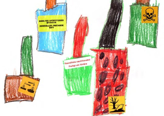 Karvian esikoululaiset piirsivät myrkkypulloja ja liimasivat niihin varoitustarroja vierailleessaan lähiapteekissaan.