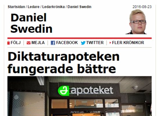 Pääkirjoitustoimittaja Daniel Swedin muistuttaa, että valtiollisen apteekkijärjestelmän purkamisesta vastannut ministeri Göran Hägglund (KD) perusteli muutosta muun muassa sillä, että "vain Albaniassa, Kuubassa ja Pohjois-Koreassa valtio vastaa Ruotsin tavoin lääkkeiden myynnistä".