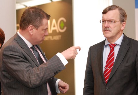 Sidosryhmäyhteistyötä Apteekkaripäivillä. Ilkka Oksala ja Kari Välimäki keskustelevat tiiviisti.