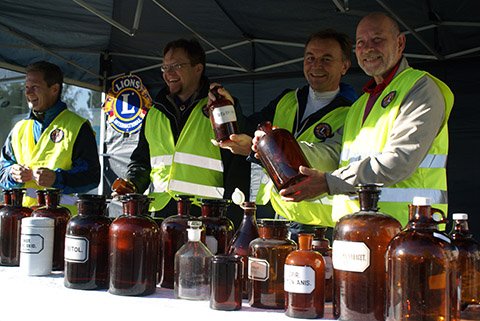 Lions Clubin jäsenet auttoivat apteekkari Ossi Sarvilahtea myymään vanhoja apteekkipulloja hyväntekeväisyyteen.