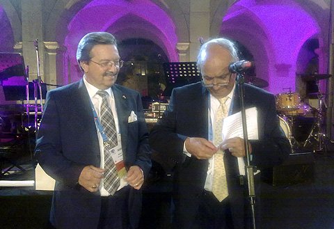 FIP:n uusi presidentti Michel Buchmann (vas.) sai edeltäjältään Kamal Midhalta evästystä tulevalle kaudelleen kongressin päättäjäisillallisilla myöhään torstai-iltana.