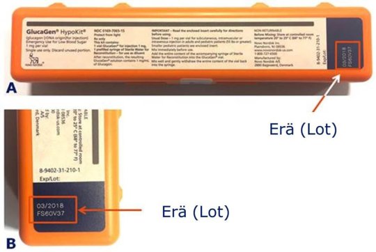A) GlucaGen-pakkaus, jossa eränumero on punaisen laatikon osoittamassa paikassa B) lähikuva eränumerosta (kuva englanninkielisestä pakkauksesta).