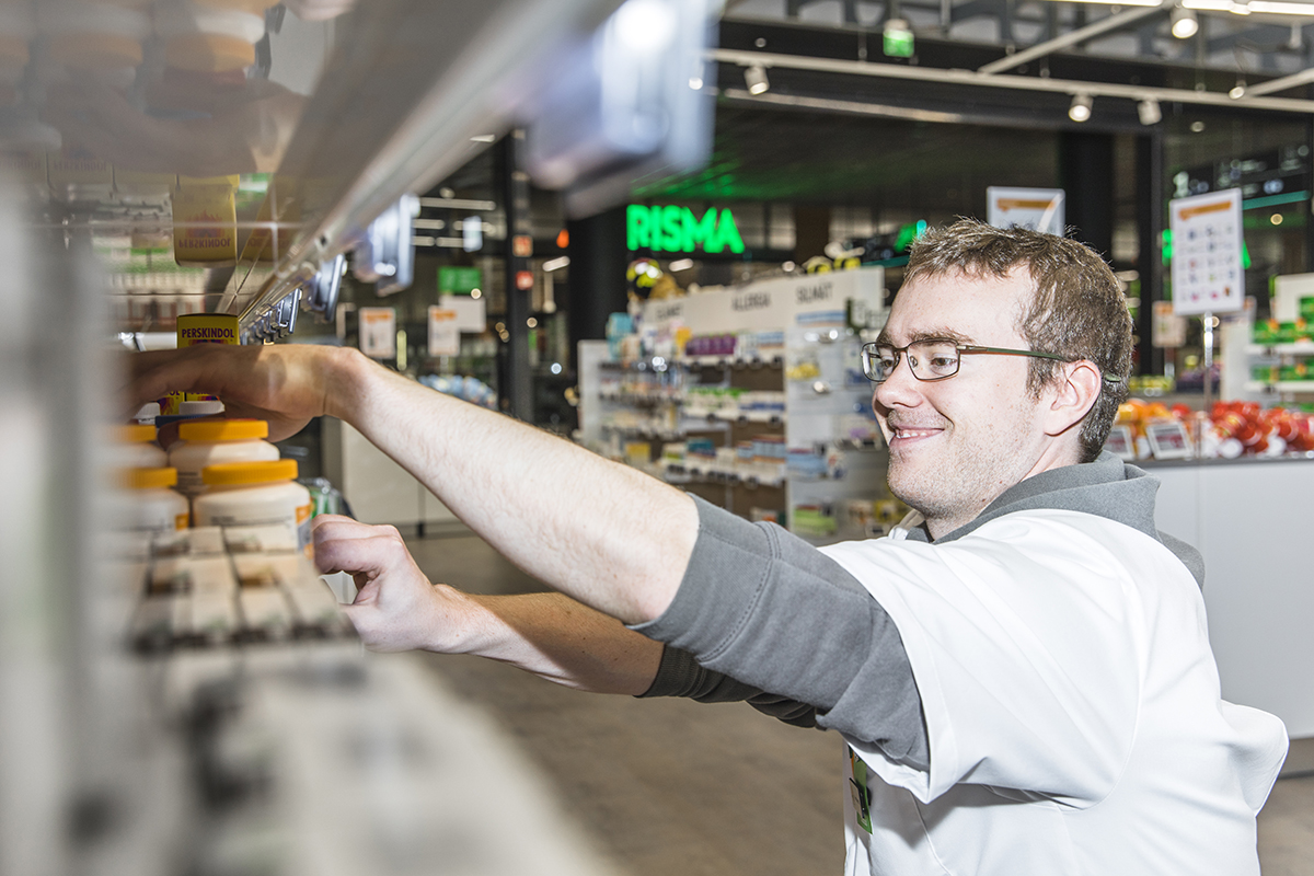 Farmaseutti Matias Kuusisto järjestelee Apteekki 51:n hyllyjä ja tykkää tehdä kauppakeskuksessa vaadittavia iltavuoroja.