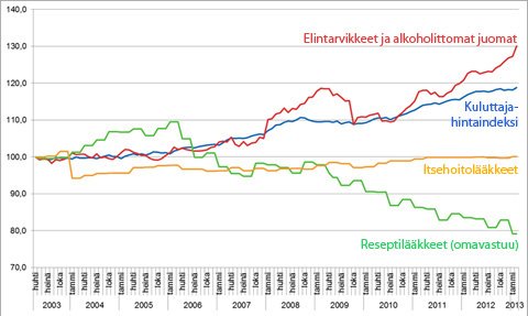 Lääkkeiden hinnoissa on tapahtunut päinvastainen kehitys kuin elintarvikkeiden hinnoissa. Tilastokeskuksen mukaan reseptilääkkeiden käyttäjät maksoivat lääkkeistään tämän vuoden helmikuussa yli 20 prosenttia vähemmän kuin huhtikuussa 2003. Samassa ajassa elintarvikkeet kallistuivat yli 30 prosenttia. Itsehoitolääkkeiden hinnat ovat samalla tasolla kuin kymmenen vuotta sitten.