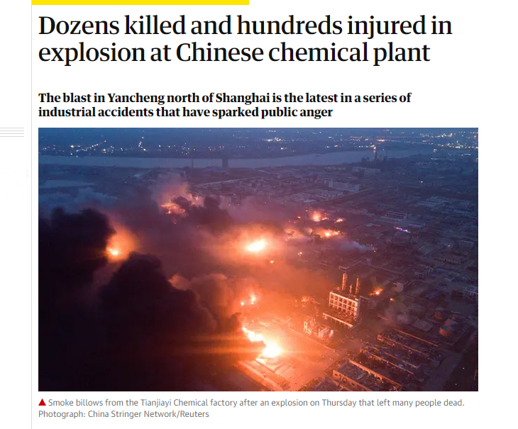 Guardian kertoi Yanchengissa sijaitsevan kemikaalitehtaan räjähdyksestä viime maaliskuussa.