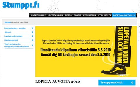 Kilpailuun voi ilmoittautua 3.5.2010 mennessä joko netissä www.lopetajavoita.fi tai postitettavalla kilpailukupongilla. Postitse lähetettäviä kilpailukuponkeja saa muun muassa apteekeista, terveysasemilta ja kirjastoista. (TK)