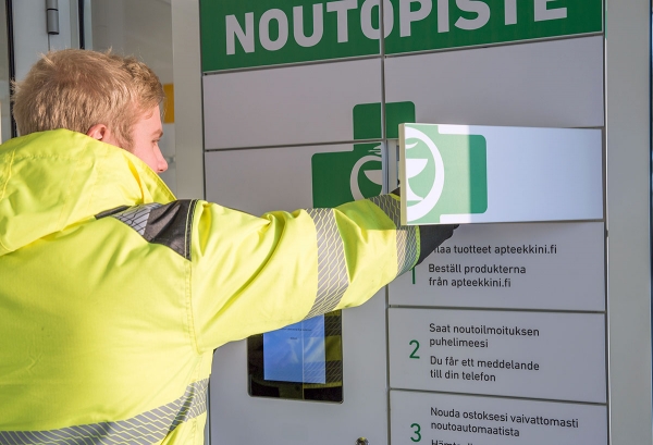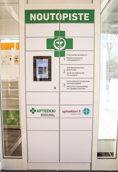 Tuulikaappiin sijoitetun noutolokerikon avulla asiakas voi noutaa verkossa tekemänsä lääkeostokset juuri silloin kun hänelle sopii. Verkko-ostosten aikana on varmistettu, että asiakas on saanut tarvitsemansa lääkeneuvonnan.