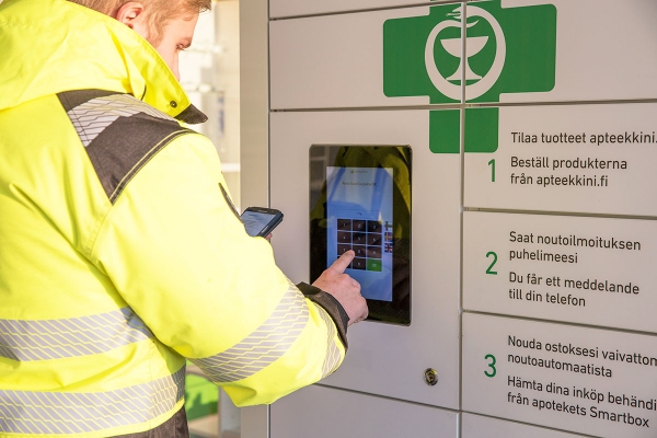 Tuulikaapissa asiakasta odottaa älykäs noutolokerikko, ja samalla koodilla asiakas voi avata ja ottaa sen sisältä tilaamansa apteekkituotteet.