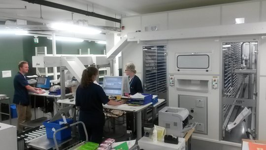 Sairaala-apteekin lääkelogistiikassa on apuna Mega-Fixu-robotti.