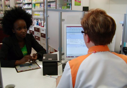 Evodie Boukono asioi Pudasjärven apteekissa farmaseutti Helena Karlbomin palveltavana.