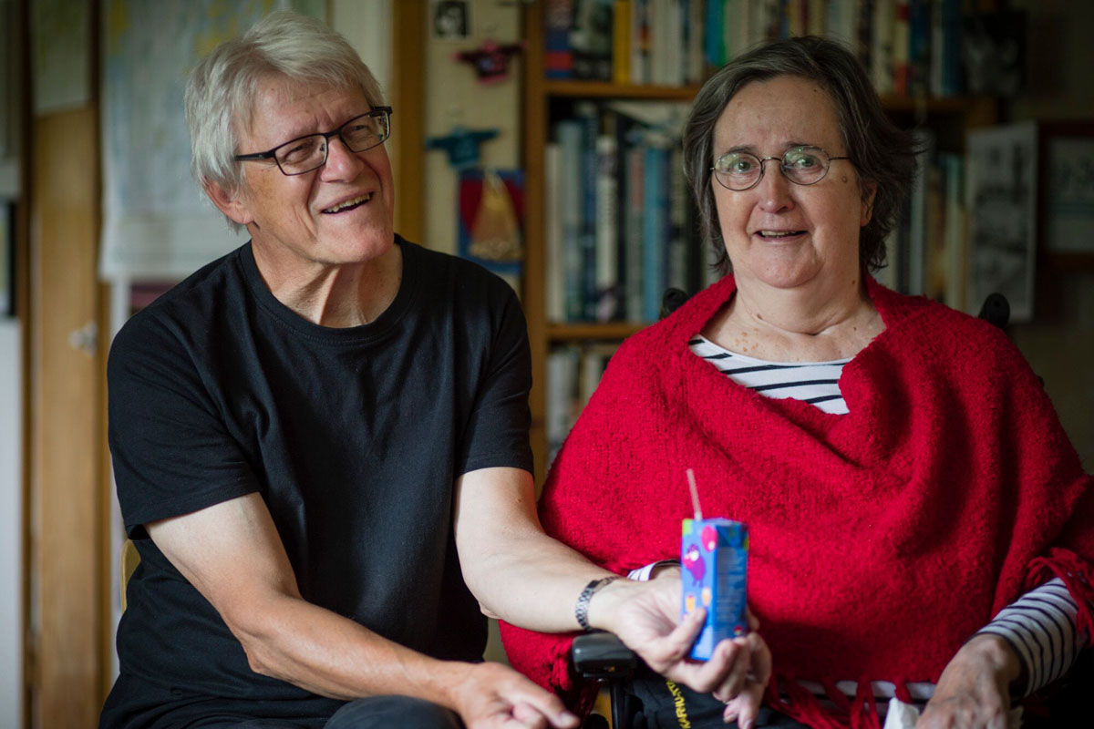 Outi Ekholm istuu pyörätuolissaan ja aviomies Jukka pitelee hänelle pillimehua. Vanhan puutalon olohuone on täynnä elettyä elämää. Seiniä kiertävät lasten valokuvat, levy- ja kirjakokoelma.