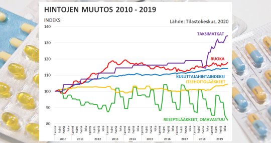 Itsehoitolääkkeiden hinnat nousivat 4,4 prosenttia, mutta nousu oli selvästi kuluttajahintaindeksiä maltillisempaa. Kuluttajahinnat nousivat viime vuosikymmenellä keskimäärin 14,3 prosenttia.