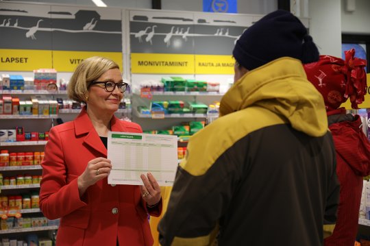 Paula Risikko jakoi asiakkaille lääkityslistapohjia osana Apteekkariliiton lääkityslistakampanjaa.