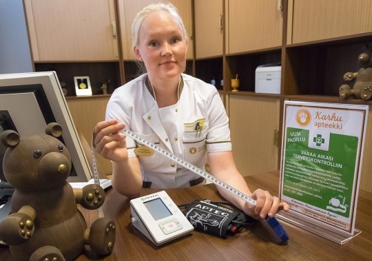 Terveydenhoitaja Maija Rautiainen pyöräyttää mittanauhan tottuneesti asiakkaan vyötärön ympäri ja kirjoittaa lukemat ylös. Nyt ei olla terveyskeskuksessa, vaan Porin Karhu apteekin tutkimushuoneessa. Rautiainen, toiselta koulutukseltaan farmaseutti, tekee asiakkaalle Terveyskontrollia.