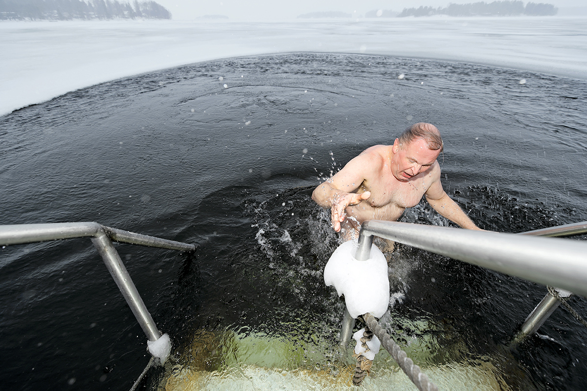 Lopulta Kanerva sukeltaa myös avantoon ja harppoo takaisin laiturille. Nautinnollinen ilme leviää kasvoille, kun veri palaa jäseniin ja endorfiini leviää kehoon.