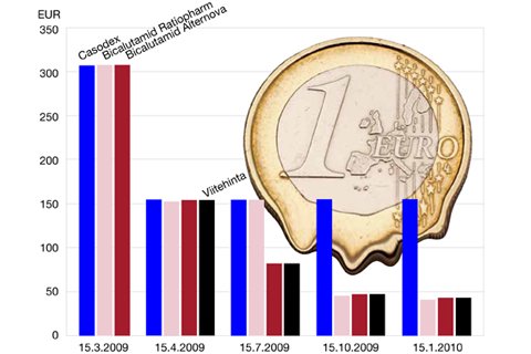 Bikalutamidivalmisteiden (150mg, 30 tabl.) nykyinen viitehinta on noin 15 prosenttia siitä, mitä valmisteet maksoivat maaliskuussa 2009.