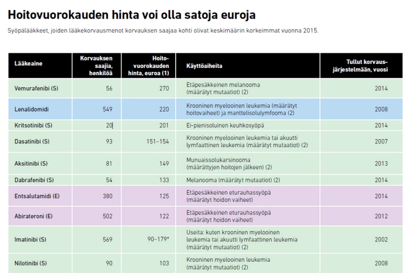 * Hoidon hinta on laskettu alkuperäisvalmisteen hintaa käyttäen. Imatinibi ei ole lääkevaihdossa, mutta edullisimman