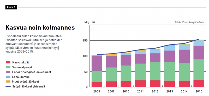 Syöpälääkkeiden kustannuskehitykseen vaikuttaa käyttäjien määrän lisäksi myös muun muassa uusien, erittäin vaikeiden syöpäsairauksien hoitojen yleistyminen avohoidossa.